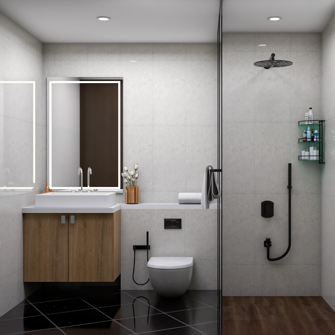 Minimal Bathroom Design With Black Fixtures and Wooden Vanity