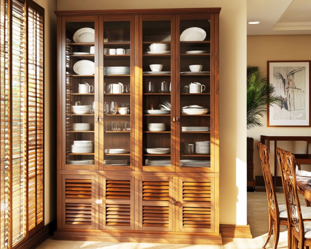 – Tall glass doors protect the contents while showcasing dishware, glassware, and decorative items.