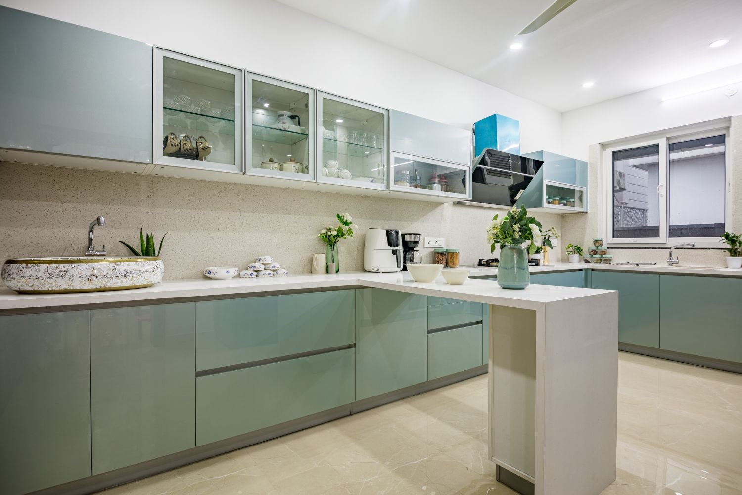 4BHK Contemporary Flat Design with Wooden Accents and L Shaped Kitchen