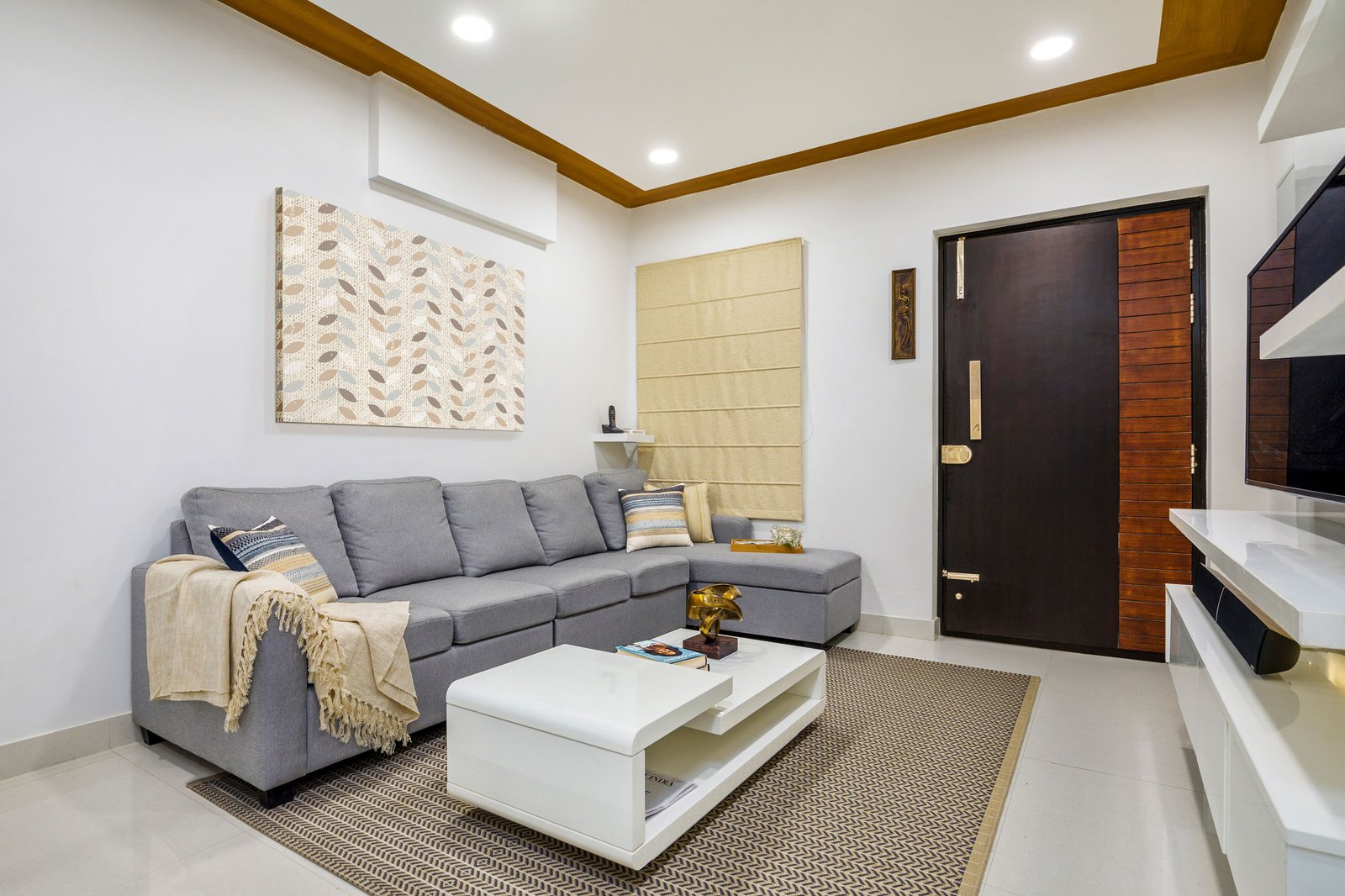 What We Love: The simple, functional furniture in earthy tones creates a vibrant and inviting atmosphere in this 2-BHK flat. The space-themed wallpaper and decor add a unique touch, making the rooms feel dynamic and lively. The combination of practicality and style ensures a comfortable and aesthetically pleasing living space.