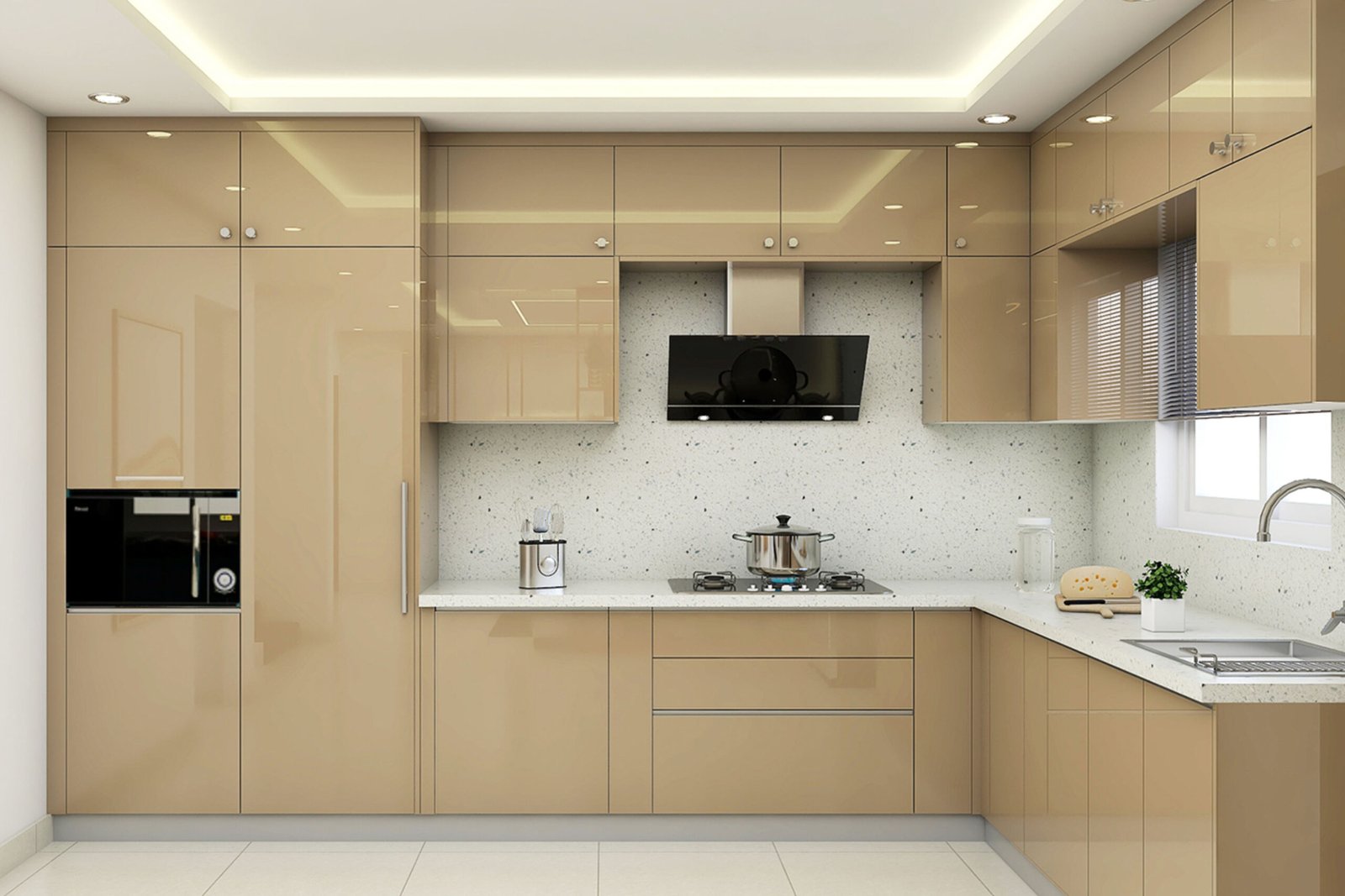 Storage Features: This modern beige kitchen features high-gloss, handleless cabinetry with ample upper and lower storage. Integrated appliances are seamlessly built-in, while spacious drawers and cabinets maximize organization and maintain the sleek, minimalist aesthetic.