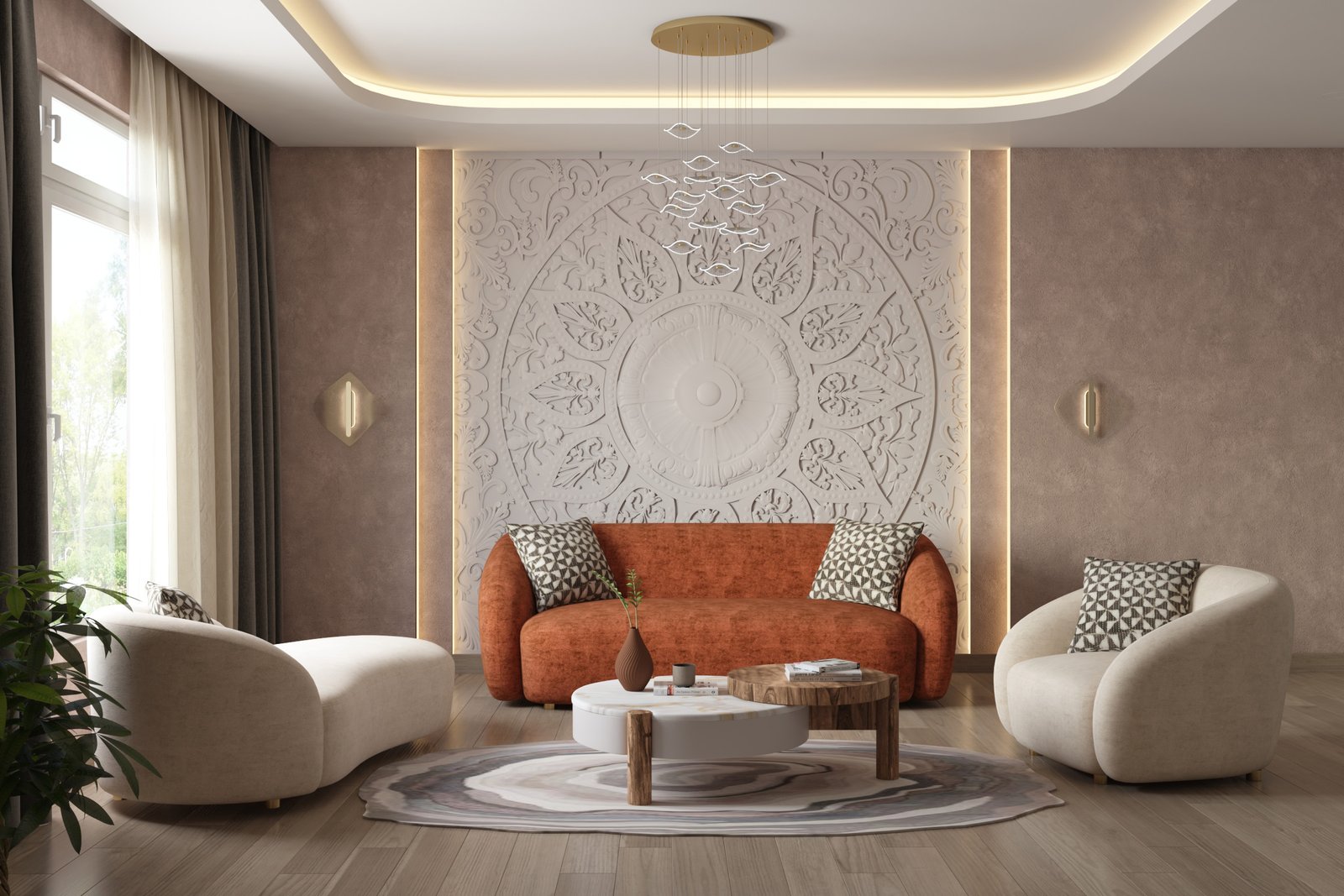 Room Highlights: An intricately textured wall panel serves as the striking centerpiece, while vibrant seating and soft lighting create a warm, inviting atmosphere perfect for relaxation and conversation.