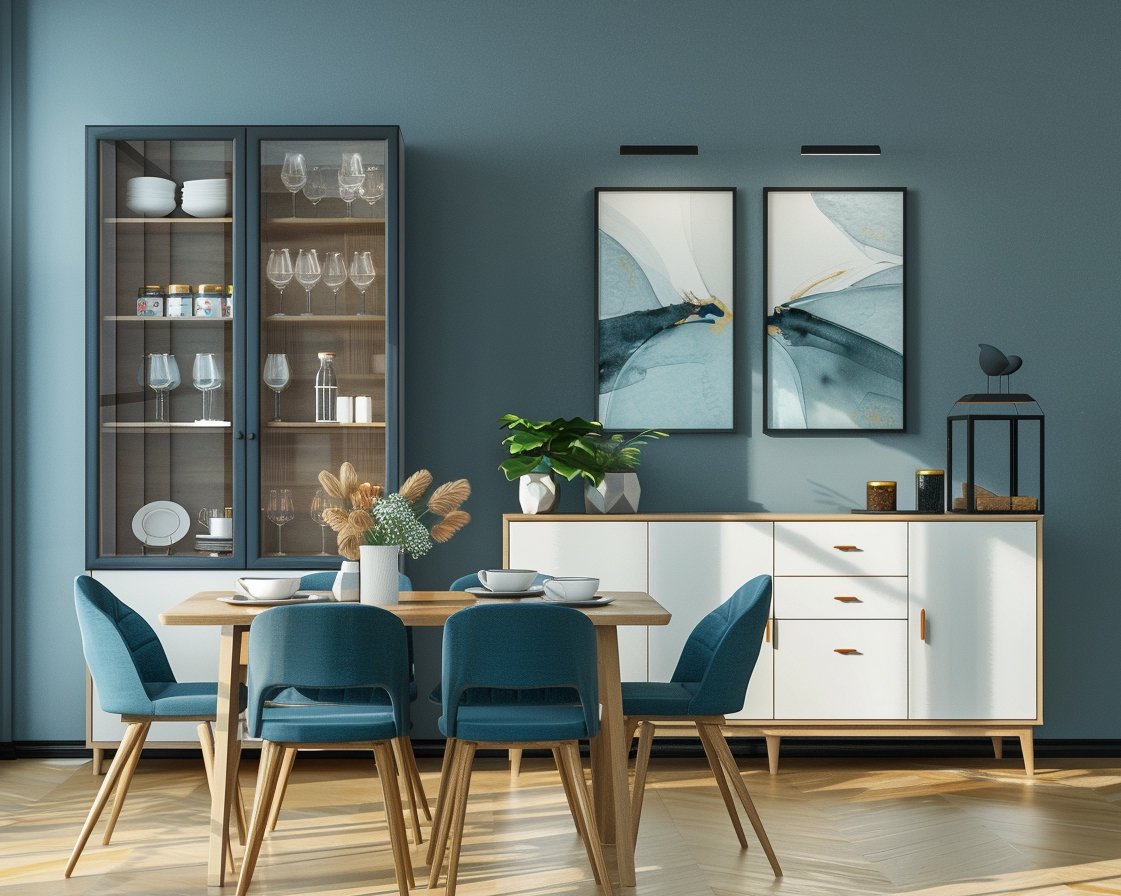 – Blue painted wall with photo frame
